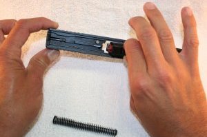 - Proceed with the disassembly of the pistol. When the slide has been separated from the frame and the recoil spring or